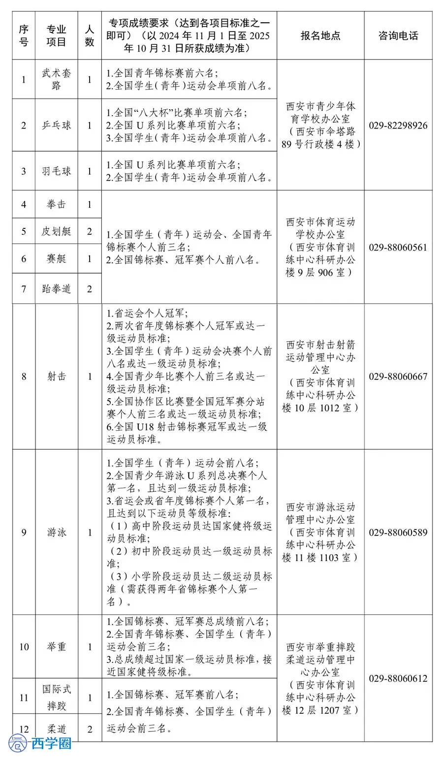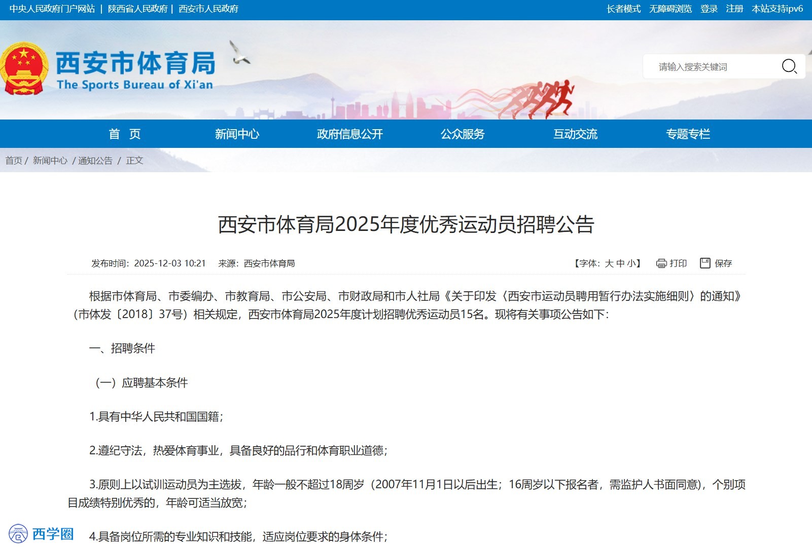 根据西安市体育局、市委编办、市教育局、市公安局、市财政局和市人社局《关于印发〈西安市运动员聘用暂行办法实施细则〉的通知》(市体发〔2018〕37号)相关规定,西安市体育局2025年度计划招聘优秀运动员15名。现将有关事项公告如下: 1 招聘条件1.具有中华人民共和国国籍; 2.遵纪守法,热爱体育事业,具备良好的品行和体育职业道德; 3.原则上以试训运动员为主选拔,年龄一般不超过18周岁(2007年11月1日以后出生;16周岁以下报名者,需监护人书面同意),个别项目成绩特别优秀的,年龄可适当放宽; 4.具备岗位所需的专业知识和技能,适应岗位要求的身体条件; 5.具备岗位所要求的专业及专项成绩要求,须代表西安市在国家和陕西省进行运动员注册。 岗位所需的具体条件、招聘项目及人数以《西安市体育局系统2025年公开招聘优秀运动员岗位及条件一览表》(见附件)为准。 1.受到过刑事处罚或者涉嫌违法犯罪正在接受调查的人员; 2.在各级各类比赛中弄虚作假、违反赛风赛纪和反兴奋剂相关规定的人员; 3.严重违反运动队相关管理规定及纪律的人员。 2 招聘程序本次招聘在西安市体育局官网统一发布公告。 1.报名:采取现场报名的方式,各专业项目报名地点见《西安市体育局系统2025年公开招聘优秀运动员岗位及条件一览表》,报名时间自2025年12月8日9:00至2025年12月12日17:00。 2.报名所需材料:报名时须提供本人身份证、毕业证、近一年(2024年11月1日至2025年10月31日)所参加赛事秩序册、成绩册及成绩证书等相关资料的原件和复印件,现场填写《西安市体育局所属训练单位优秀运动员招聘报名表》,每人限报1个岗位。 3.资格审查。由西安市体育局所属各训练单位负责组织实施。 根据招聘岗位的要求,对符合条件的应聘者在《招聘报名表》上签署审查通过的意见。对应聘人员的资格审查工作,将贯穿考核招聘工作的全过程。应聘人员提供的证明材料及填报的信息如有不实之处,一经发现,随时取消应聘资格。 考核满分100分,包括专业基础知识、专项素质测试、专项身体素质测试、身体机能测试等内容。考核的时间、地点由市体育局所属各训练单位另行通知。 考核成绩在西安市体育局官网公布。根据考核成绩,按照与岗位招聘计划1:1的比例从高分到低分确定参加体检与考察人员。考核成绩低于60分的,不得进入体检与考察环节。 体检与考察工作由市体育局所属各训练单位组织实施,体检项目结合各运动项目特点、参照《公务员录用体检通用标准(试行)》及有关规定执行,体检费用由应聘人员自理。考察工作重点考察应聘人员的思想政治表现、道德品质以及与招聘岗位相关的专业素养、业务能力等,并再对应聘人员的资格条件进行复审。体检、考察不合格者,取消应聘资格,不再进行递补。 根据考核、体检、考察结果,确定拟聘人员。拟聘人员由市体育局所属各训练单位审核汇总后,报西安市体育局核准,并在西安市体育局官网公示。公示内容包括拟聘人员姓名、出生年月、运动项目、近一年内取得的最好成绩等情况。公示期为5个工作日。 拟聘人员公示期满后,由西安市体育局按程序报西安市人社局审批办理相关聘用手续。 3 纪律要求考核招聘工作严格遵守法律法规和事业单位公开招聘有关纪律,自觉接受社会及纪检监察部门的监督。对考核招聘工作中出现的违规违纪违法行为,一经查实,按有关规定予以严肃处理,保证考核招聘工作的公开、公平、公正。 4 其他事项对于招聘岗位工作职责、招聘资格条件、报名所需资料等具体问题可直接电话咨询市体育局所属各训练单位,咨询电话详见招聘岗位表。 政策咨询电话:029-67097980 西安市体育局 2025年12月3日 |