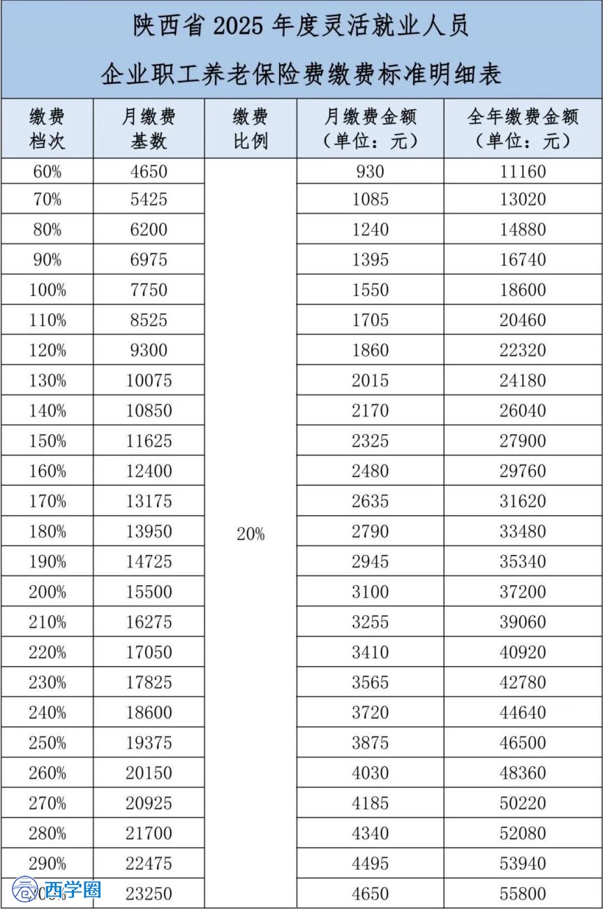 1 缴费截止时间2025年度陕西灵活养老保险费缴费业务,截止时间为2026年6月30日。不只西安市,整个陕西省缴费截至时间都是一致的。 2 缴费申报标准2025年度职工基本养老保险缴费基数上限标准为23250元/月,下限标准为4650元/月,缴费比例为20%。灵活就业人员可在本年度缴费基数上下限之间选择适当的缴费基数档次缴费,具体缴费基数档次标准如下: