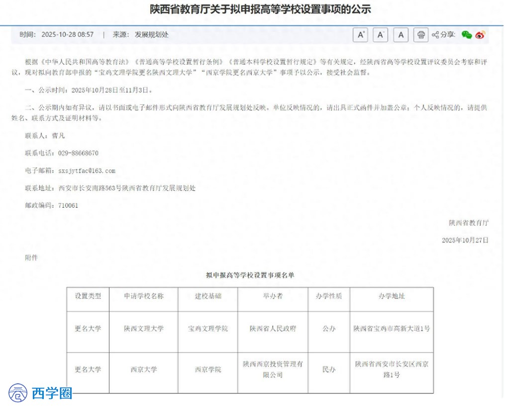 学生规模的急剧扩大倒逼校园升级,2001年,西京人在长安区神禾原开启了新校区建设的壮举。任万钧带领团队在塑料篷布搭建的“工地指挥部”日夜奋战,即便劳累过度生病,仍手持吊瓶坚守工地,最终以“挑战极限”的精神,在160天内完成16万平方米校区建设,实现了当年征地、当年建设、当年使用的奇迹,为学校后续发展奠定了坚实基础。2005年,学校迎来历史性跨越,经教育部批准升格为普通本科高校,正式更名为西京学院,开启了本科教育的新征程。 2 西京学院发展史历经近三十年积淀,如今的西京学院已发展成为一所学科门类齐全、办学特色鲜明、综合实力雄厚的民办高等学府,为更名西京大学奠定了坚实的基础。在学科专业建设方面,学校已形成工、管、艺、理、文、经、医等七大学科门类协调发展的格局,重点发展新材料、土木水利、智能制造等贴合区域产业需求的学科领域。目前设有11个学院和2个教育中心,拥有11个硕士专业学位点、39个本科专业,构建起工学、经济管理、人文艺术三大专业群,其中包含2个国家级一流本科专业建设点、11个省级一流本科专业建设点,1个国家级特色专业。2024年,学校“工程科学”学科成功进入ESI全球排名前1%,2025年电子信息、审计获批陕西省重点建设学科,学科实力得到业界广泛认可。 师资队伍是办学质量的核心保障。学校秉持“师德为先、教学为要、科研为基、发展为本”的理念,构建起多元化师资体系。截至2025年4月,专任教师达1139人,其中高级职称教师占比43.3%,硕士及以上学位教师占比91.2%。队伍中汇聚了陕西省科技创新领军人才、青年科技新星、教学名师、教书育人楷模等一批高层次人才,拥有“三秦学者创新团队”“陕西省高校黄大年式教师团队”等23个省级教学、科研团队,为人才培养和科研创新提供了强大支撑。 在人才培养方面,学校坚守“三个一切”(一切为了学生、为了一切学生、为了学生一切)的办学理念,秉持“诚健博能”的校训,以培养具有“匠心精神+艺术素养”的应用型人才为目标,推行“价值引领、优势成长”的学生个性发展观。作为教育部“互联网+中国制造2025”产教融合促进计划试点高校,学校建有7个省级实验教学示范中心、2个虚拟仿真实验教学中心,获批2门国家级“一流课程”、31门省级“一流课程”。学生在学科竞赛中表现优异,2019—2023年在全国“民办及独立学院”大学生竞赛榜单位列第8位,研究生创新实践系列大赛成绩在全国高校中位居前列。建校以来,学校已累计为国家培养输送17万余名优秀学子,先后荣获“全国教育系统先进集体”“全国毕业生就业典型经验高校”“全国创新创业典型经验高校”等荣誉称号。 如今的西京学院,全日制在校生达17000余人,其中研究生1000余人,校园占地1647.86亩,建有西京博物馆、校史馆等文化场馆,山水相映,文化氛围浓厚。在国际交流合作方面,学校与多个国家和地区的高校建立合作关系,开展研学、交流、本升硕等项目,2023年设立国际教育学院开展留学生培养,形成了多层次的国际交流格局。在2025年软科中国民办高校排名中,学校位居第8名,综合实力得到社会广泛认可。 3 西京大学未来展望从民办西京大学(筹)到西京学院,再到如今即将更名西京大学,名称的更迭背后,是学校校长和全体师生的坚守与奋进,更是学校办学层次、综合实力持续提升的有力见证。此次更名已通过省级公示,进入教育部审批的关键阶段,结合学校坚实的办学基础和正常的审批流程,2026年很大可能成功更名并以“西京大学”名义开始招生。 “学院”与“大学”在中国的高等教育体系中有明确的区别,更名不仅是名称的改变,更是办学水平、综合实力和社会声誉的提升,对学校具体办学要求异同参下表。