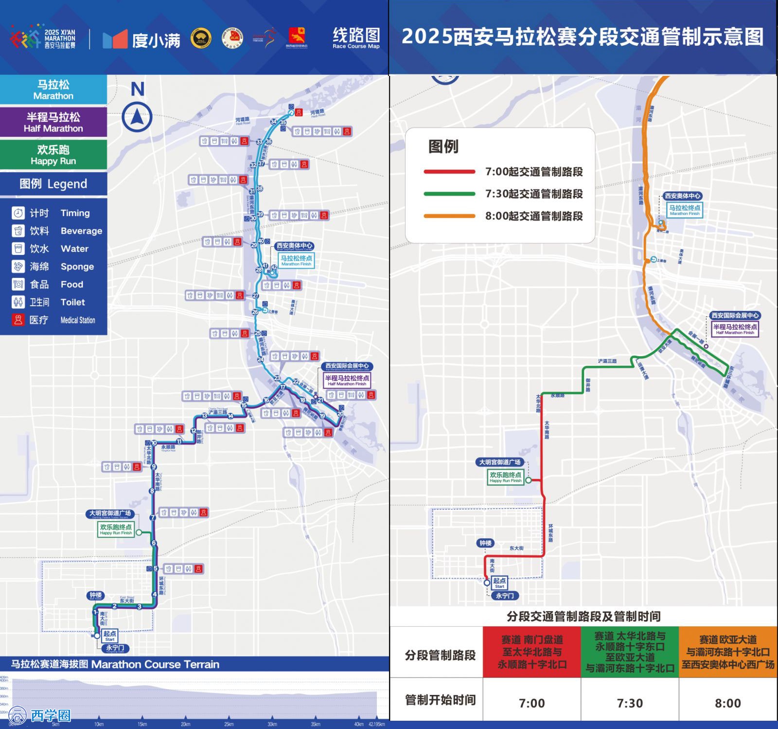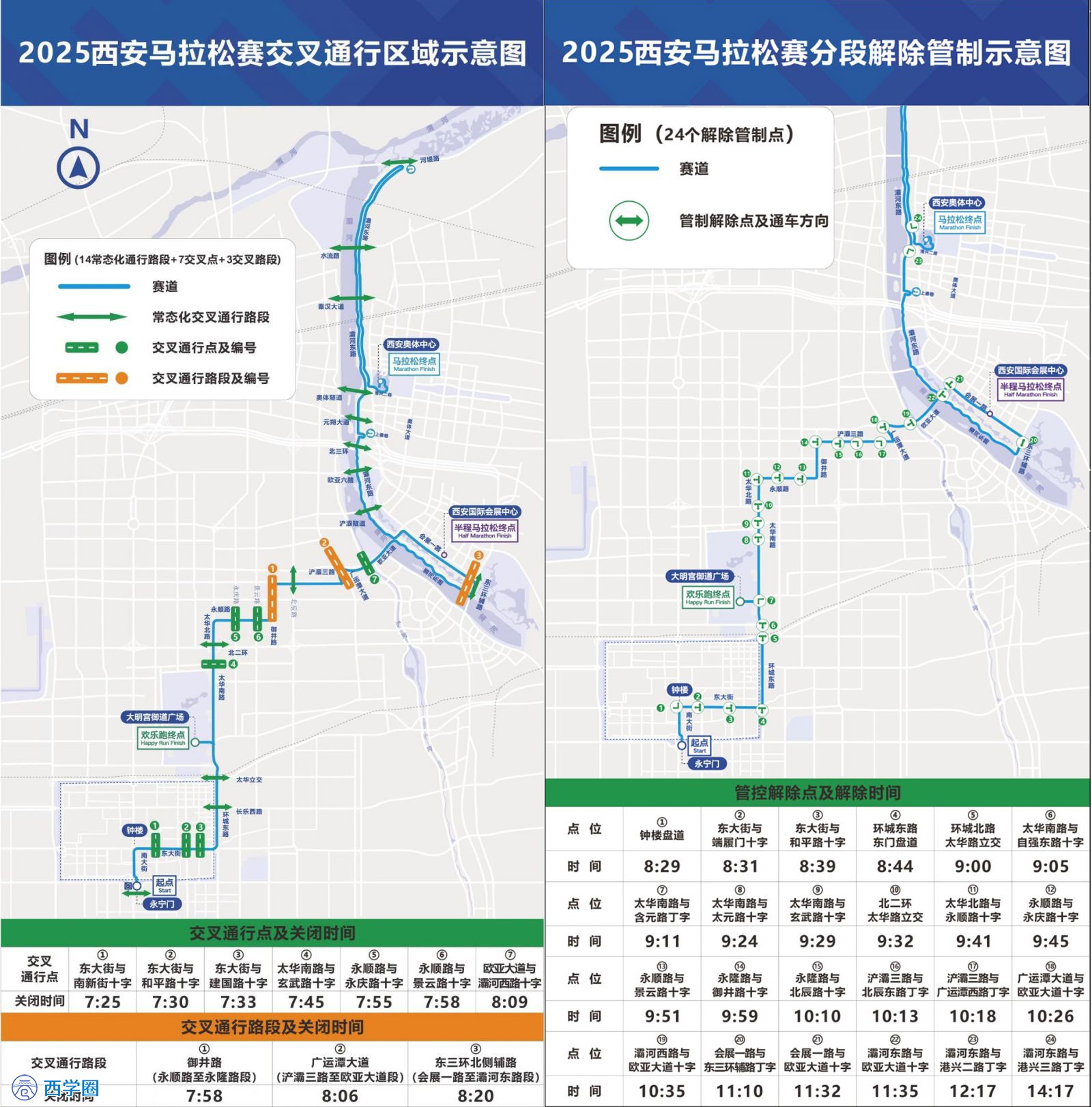 | 一、赛事路线 全程马拉松路线:永宁门东侧盘道(起点)→南大街→钟楼盘道(逆行)→东大街→长乐门盘道→环城东路北段→太华南路→太华北路→永顺路→御井路(逆行)→永隆路→浐灞三路→广运潭大道→欧亚大道→灞河东路→东三环北侧辅路(逆行)→会展一路→欧亚大道→灞河东路(逆行)→上善巷→上善巷折返处(折返)→上善巷→灞河东路(逆行)→灞河东路与河堤路南侧折返处(折返)→灞河东路(逆行)→西安奥体中心西广场南侧道路→西安奥体中心体育场(终点) 半程马拉松路线:永宁门东侧盘道(起点)→南大街→钟楼盘道(逆行)→东大街→长乐门盘道→环城东路北段→太华南路→太华北路→永顺路→御井路(逆行)→永隆路→浐灞三路→广运潭大道→欧亚大道→灞河东路→东三环北侧辅路(逆行)→会展一路(西安国际会展中心终点) 欢乐跑路线:永宁门东侧盘道(起点)→南大街→钟楼盘道(逆行)→东大街→长乐门盘道→环城东路北段→太华南路(逆行)→望仙三路→大明宫御道广场(终点) 2025西安马拉松赛事期间对部分道路采取交通管制的通告(时间 路段) 二、赛事期间,除持有2025西安马拉松比赛专用证件的车辆和人员外,其他机动车、非机动车、行人禁止在赛道内通行 (一)赛事准备期间交通管制措施 1.10月17日6时至10月19日活动结束,对会展一路(西会展路至东会展路段),实行交通管制。 2.10月18日22时至10月19日活动结束,对长安北路(南门至南稍门十字北口段)、南门盘道(不含南门下穿隧道)、南大街(南大街北口至南门盘道段),实行交通管制。 3. 10月19日0时至活动结束,对南稍门十字实行交通管制。 4. 10月19日4时至8时,对长安北路(南稍门十字南口至南二环长安路立交段),实行交通管制。 5. 10月18日22时起,赛道全段(含机动车道、非机动车道、人行道)禁止停放各类机动车、非机动车,禁止堆放各类物品。 (二)赛事进行期间交通管制措施 1. 10月19日7时起,对赛道南门盘道至太华北路与永顺路十字北口实行交通管制。 2. 10月19日7时30分起,对赛道太华北路与永顺路十字东口至欧亚大道与灞河东路十字北口实行交通管制。 3. 10月19日8时起,对赛道欧亚大道与灞河东路十字北口至西安奥体中心西广场实行交通管制。 2025西安马拉松赛事期间对部分道路采取交通管制的通告(时间 路段) 三、赛事期间,为最大限度减少对群众出行的影响,在实施交通管控措施后,沿赛道共设置了14个常态化交叉通行点,7个交叉通行点及3个交叉通行路段,具体情况如下: (一)常态化交叉通行点 1.环城南路南门隧道(东西向) 2.朝阳门外长乐西路(东西向) 3.环城北路太华路立交下穿隧道(东西向) 4.北二环太华路立交桥上(东西向) 5.北辰路高架桥上(南北向) 6.东三环广运大桥上(南北向) 7.浐灞隧道(东西向) 8.欧亚六路兴运大桥上(东西向) 9.北三环秦灞桥上(东西向) 10.元朔大桥上(东西向) 11.奥体隧道(东西向) 12.秦汉大道灞河桥上(东西向) 13.河堤路(东西向) 14.港盛大桥上(东西向) (二)交叉通行点 1.东大街与南新街十字 南北通行时间延长至10月19日7:25截止 2.东大街与和平路十字 南北通行时间延长至10月19日7:30截止 3.东大街与建国路十字 南北通行时间延长至10月19日7:33截止 4.太华南路与玄武路十字 东西通行时间延长至10月19日7:45截止 5.永顺路与永庆路十字 南北通行时间延长至10月19日7:55截止 6.永顺路与景云路十字 南北通行时间延长至10月19日7:58截止 7.欧亚大道与灞河西路十字 南北通行时间延长至10月19日8:09截止 (三)交叉通行路段 1.御井路(永顺路至永隆路段); 南北通行时间延长至10月19日7:58截止 2.广运潭大道(浐灞三路至欧亚大道段); 南北通行时间延长至10月19日8:06截止 3.东三环北侧辅路(会展一路至灞河东路段); 南北通行时间延长至10月19日8:20截止 (四)交叉通行对象 1.常态化交叉通行路口可全天正常通行; 2.社会车辆可在各交叉通行区域关闭前通行; 3.急救、救援等应急车辆可在各交叉通行区域关闭后,得到许可后安全通行。 2025西安马拉松赛事期间对部分道路采取交通管制的通告(时间 路段) 四、赛事期间,为尽快恢复社会面交通运行,最大限度保障市民正常出行,结合赛事关门时间,交通管理部门沿赛道共设置了24个交通管制解除点位,并将根据赛事实际运行情况,对除进入赛道方向,滚动恢复其它方向道路通行,具体情况如下: 1.钟楼盘道预计8:29解除管制; 2.东大街与端履门十字预计8:31解除管制; 3.东大街与和平路十字预计8:39解除管制; 4.环城东路东门盘道预计8:44解除管制; 5.环城北路太华路立交预计9:00解除管制; 6.太华南路与自强东路十字预计9:05解除管制; 7.太华南路与含元路丁字预计9:11解除管制; 8.太华南路与太元路十字预计9:24解除管制; 9.太华南路与玄武路十字预计9:29解除管制; 10.北二环太华路立交预计9:32解除管制; 11.太华北路与永顺路十字预计9:41解除管制; 12.永顺路与永庆路十字预计9:45解除管制; 13.永顺路与景云路十字预计9:51解除管制; 14.永隆路与御井路十字预计9:59解除管制; 15.永隆路与北辰路十字预计10:10解除管制; 16.浐灞三路与北辰东路丁字预计10:13解除管制; 17.浐灞三路与广运潭西路丁字预计10:18解除管制; 18.广运潭大道与欧亚大道十字预计10:26解除管制; 19.灞河西路与欧亚大道十字预计10:35解除管制; 20.会展一路与东三环辅路丁字预计11:10解除管制; 21.会展一路与欧亚大道